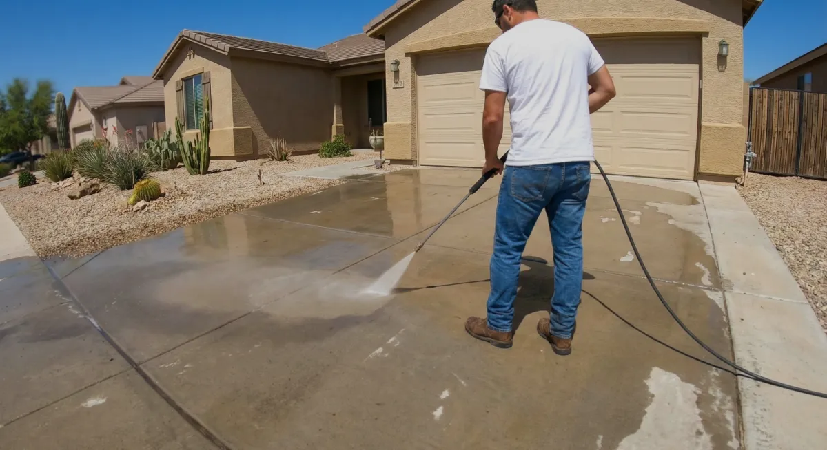 Professional exterior cleaning for driveways, patios, porches, fences, walkways, and pool decks.